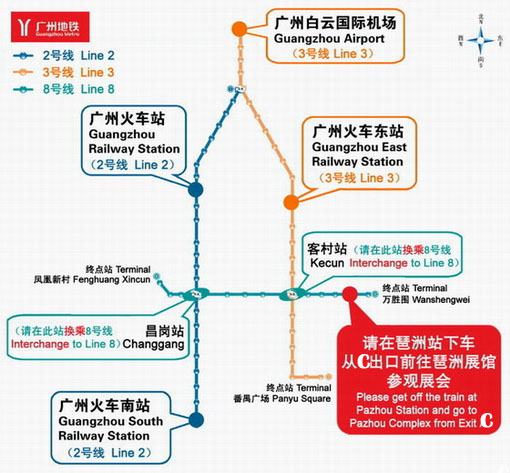 如果您就近搭乘地鐵三號線,請在客村站下車,轉乘地鐵八號線(開往萬勝圍方向),在琶洲站下車,C出口出站。
